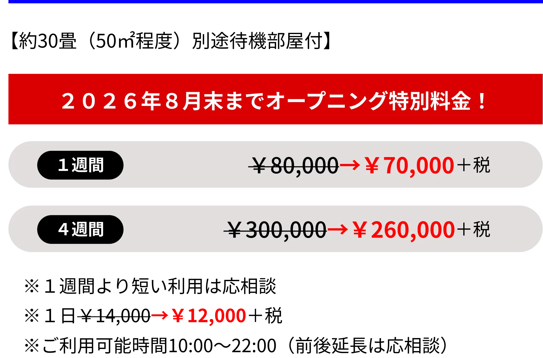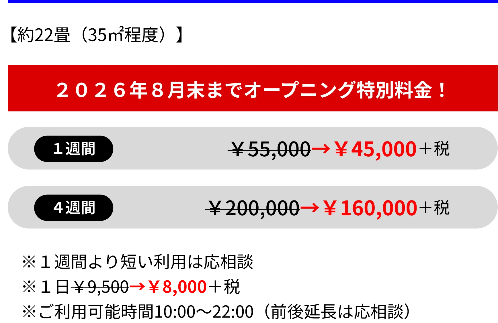 注意:オープニング期間中は改装工事を並行して行なっている可能性がございますので予めご了承ください。