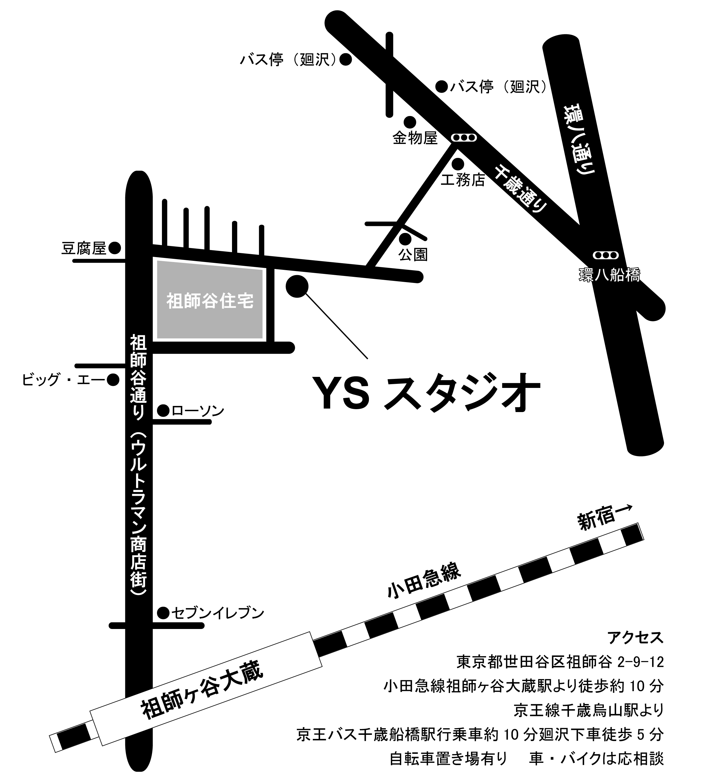 京王線千歳烏山駅より京王バス千歳船橋駅行乗車約10分廻沢下車徒歩5分